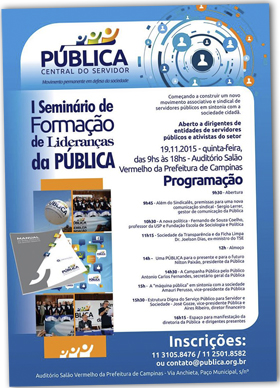 Informamos aos nossos filiados que participaremos de um importante evento em Campinas/SP este mês. Dia 19 de novembro, a Pública - Central do Servidor, realiza o 1º Seminário de Formação de Lideranças no Auditório Salão Vermelho da Prefeitura de Campinas, que fica na Via Anchieta, Paço Municipal, s/nº. Todos os filiados estão convidados e poderão se inscrever diretamente na Central.