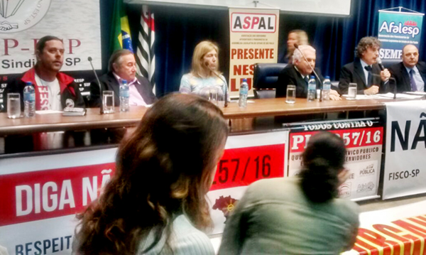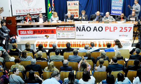 Mais de 300 lideranças de diversas entidades sindicais estiveram reunidas na tarde de ontem (17), na Assembleia Legislativa do Estado de São Paulo (Alesp), para ampliar o diálogo sobre ações de combate ao PLP 257/16 de autoria do Governo Federal. A matéria tem o objetivo de estender o prazo para que os Estados paguem suas dívidas, mas possui contrapartidas prejudiciais ao funcionalismo geral.