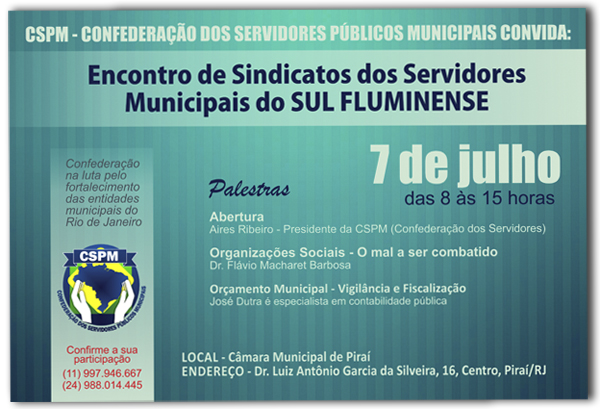 Os coordenadores da CSPM no Rio de Janeiro, José Raimundo (Schell) e Rejane Couto Araújo, estão no comando da organização do Encontro de Sindicatos dos Servidores Municipais do Sul Fluminense. O evento vai ocorrer no dia 7 de julho, das 8 às 15 horas, na Câmara Municipal de Piraí.