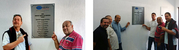 Dirigentes apontam orgulhosamente para a placa inaugural e compartilham da emoção desta conquista |