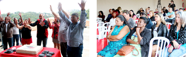 Um dos momentos mais emocionantes foi o parabéns e o corte do bolo; dirigentes se uniram com alegria |