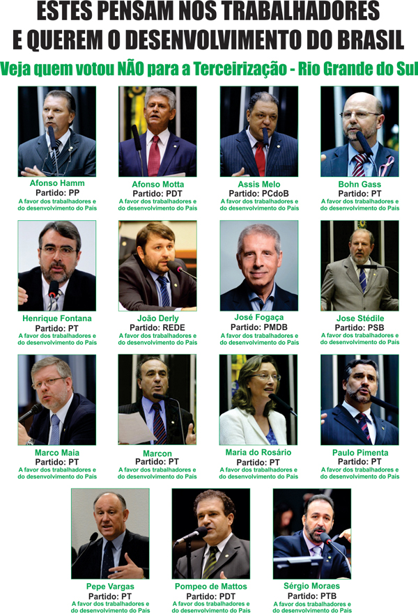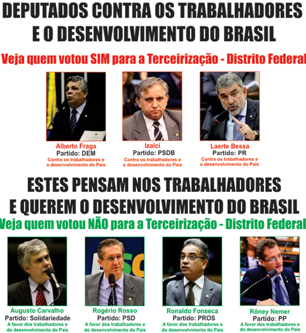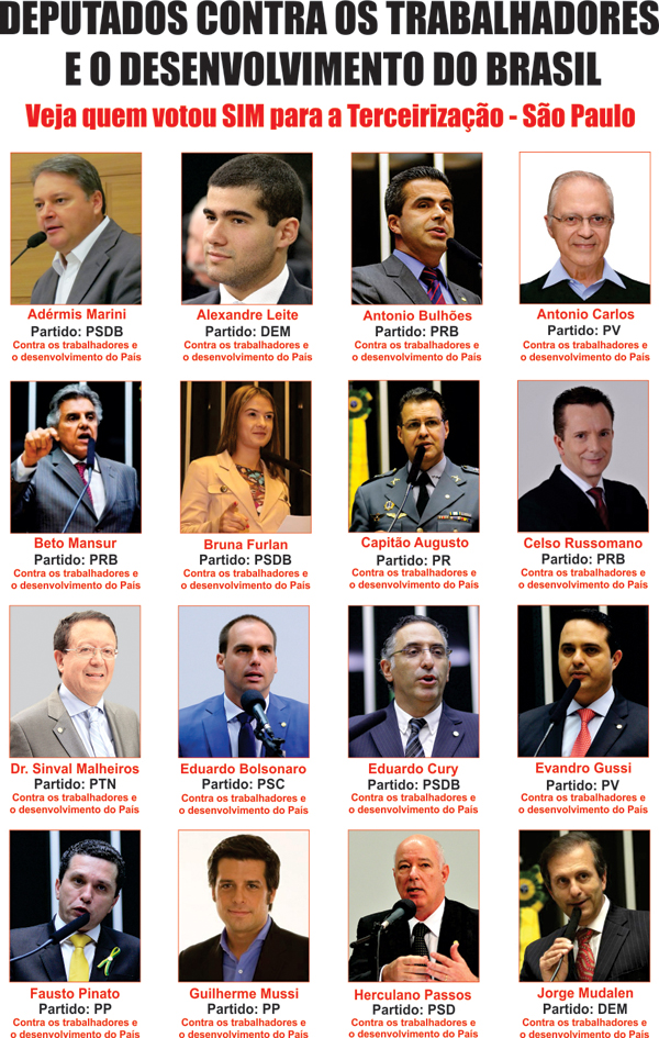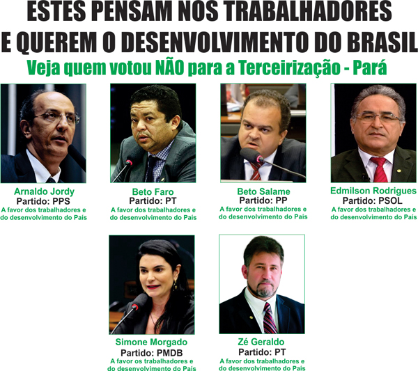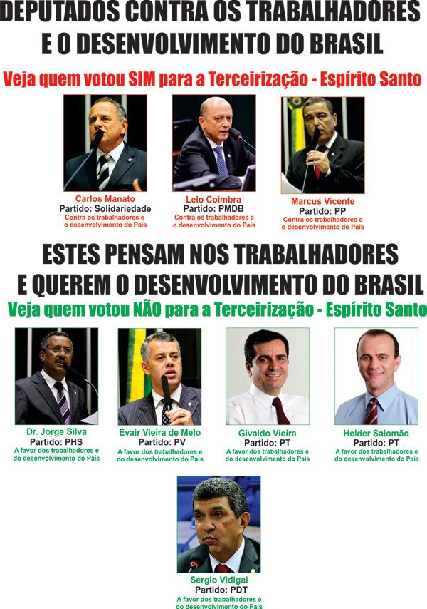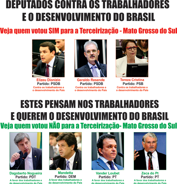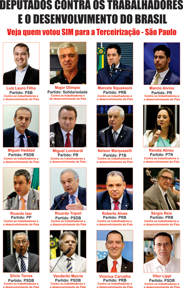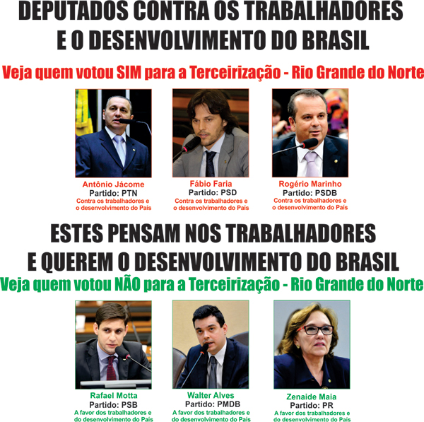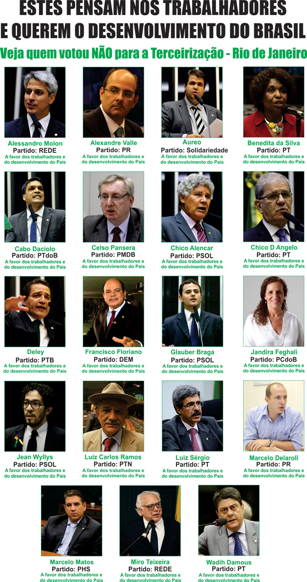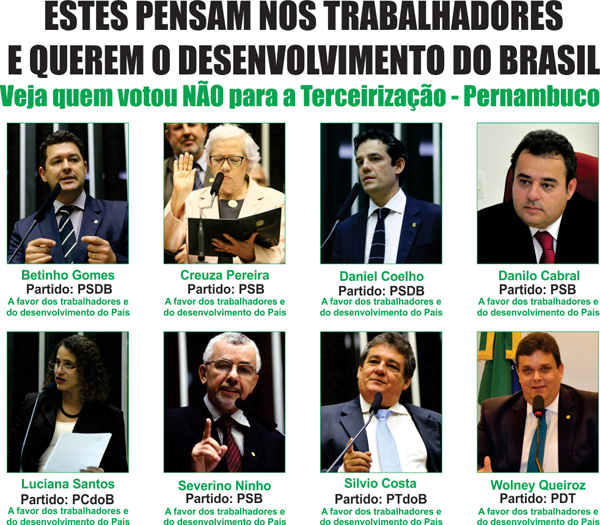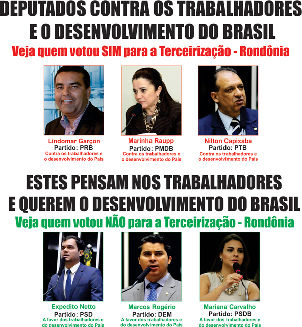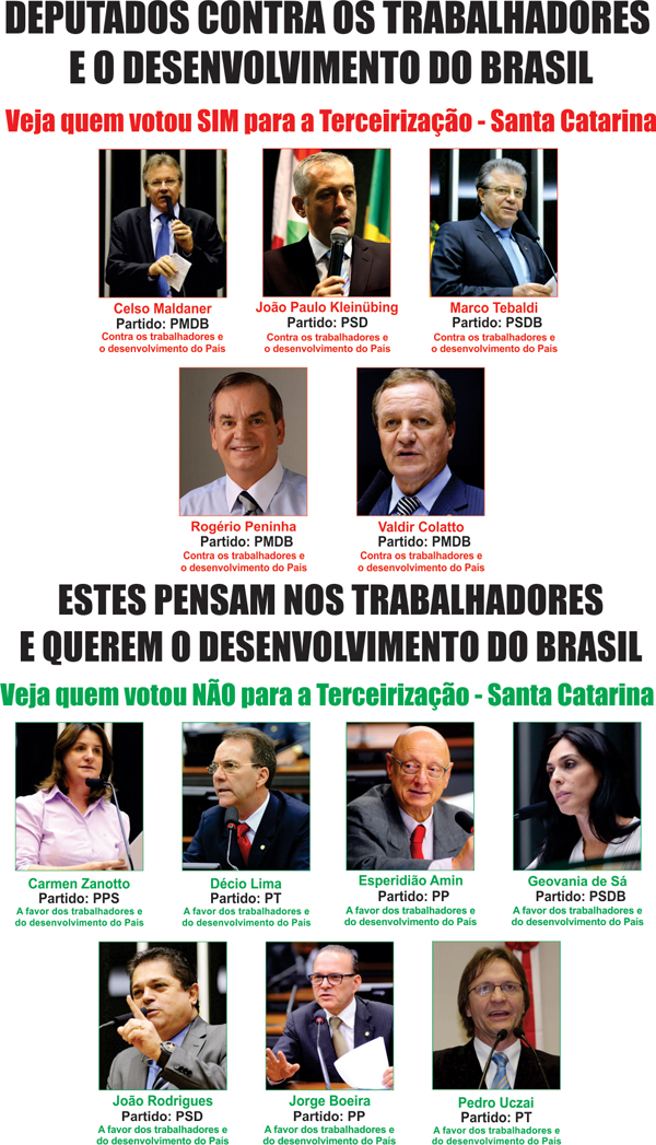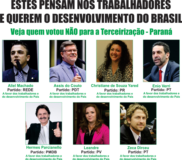 COMPARTILHE! - Você, trabalhador, que lê essa matéria, tem duas missões: 1) Divulgar o máximo que puder em suas redes sociais e nos grupos que participa, além de mandar para o máximo de contatos no Whats; 2) Não votar nesses sujeitos favoráveis à Terceirização nas eleições para deputado federal em 2018.