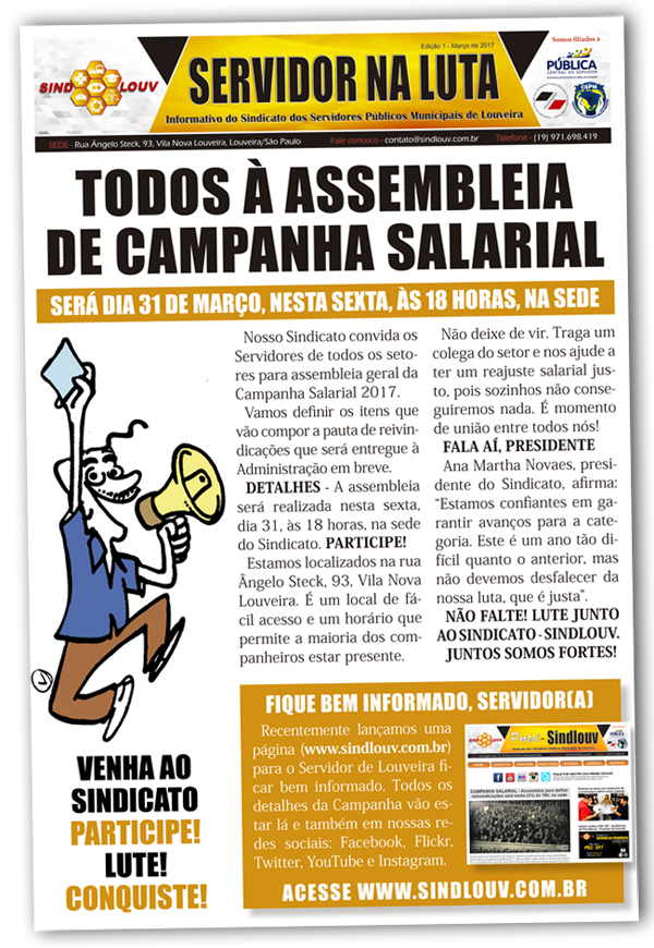 Em época de Campanha Salarial, o SindLouv (Sindicato dos Servidores de Louveira) faz uma convocação para que todos os dirigentes das regiões próximas compareçam na assembleia geral com a categoria que irá definir as reivindicações da Campanha. Será na próxima sexta, dia 31 de março, às 18 horas, na sede do Sindicato, que fica na rua Ângelo Steck, 93, Vila Nova Louveira.