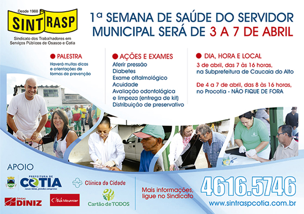 O SintraspCotia (Sindicato dos Servidores local) irá realizar uma iniciativa inédita, a 1ª Semana de Saúde do Servidor Municipal, que vai ocorrer entre os dias 3 e 7 de abril, na Subprefeitura de Caucaia do Alto e na Procotia, para todos os Servidores do município. A proposta visa prestar atendimento de qualidade aos trabalhadores de Cotia e estreitar a relação com a base através do benefício.