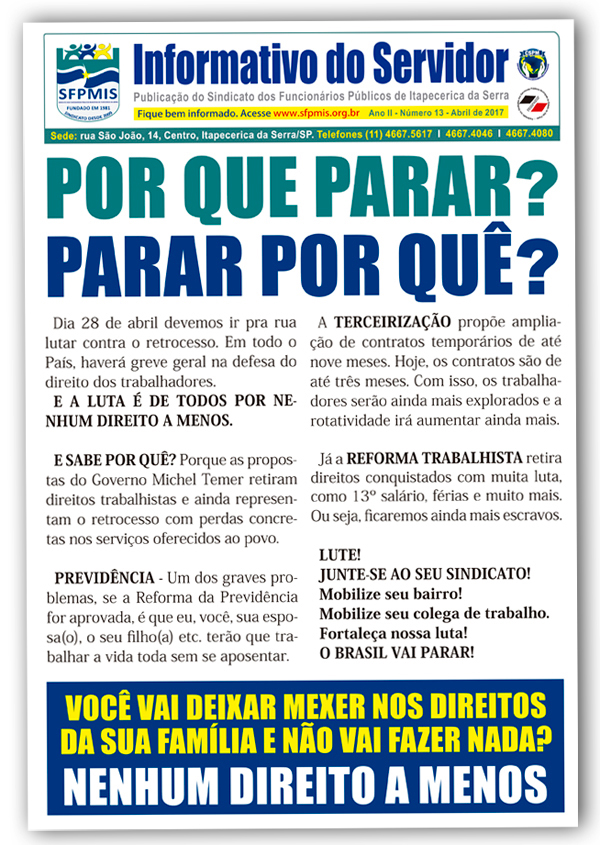 A nova edição do Boletim "Informativo do Servidor", do SFPMIS (Sindicato dos Servidores de Itapecerica da Serra), com a manchete "Por que parar? Parar por quê?" convoca os Servidores para participar da greve geral no dia 28 de abril. As propostas do Governo Michel Temer, que tiram direitos trabalhistas, são uma regressão com perdas concretas. Isso é o motivo central do protesto.