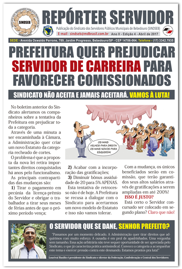 Os Servidores de Bebedouro, cidade do interior de São Paulo, permanecem sob constante ameaça de retirada de direitos adquiridos pelo seu Sindicato. Através