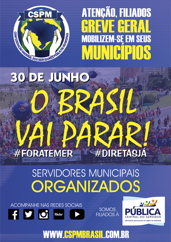 FALA AÍ, PRESIDENTE - "É com esse compromisso de se juntar a outras instituições que a CSPM participará de mais uma greve geral, dia 30 de junho. Além de estar presente nas principais ações, oriento os mais de 100 Sindicatos do setor municipal que mobilizem-se em suas cidades. É momento dos trabalhadores juntarem todos os seus familiares e irem às ruas lutar por direitos já conquistados que querem tirar de nós", afirma Aires Ribeiro, presidente da Confederação.