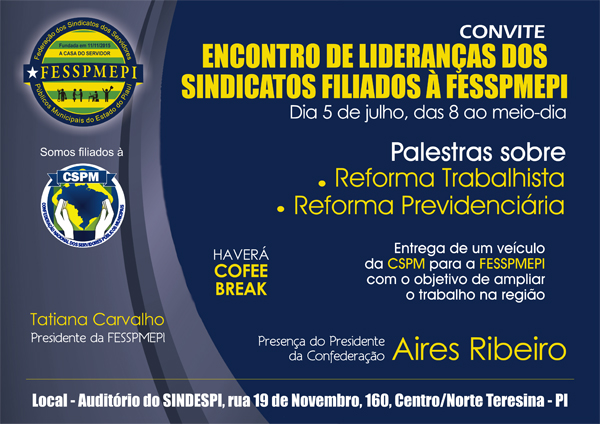 A Federação dos Sindicatos dos Servidores Públicos Municipais do Estado do Piauí (Fesspmepi) organiza na próxima quarta, dia 5, o encontro de lideranças sindicais. O evento é voltado para os sindicalistas que integram o time de filiados à entidade