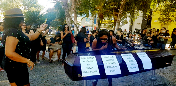 dos vereadores. Em posse de um caixão com os nomes dos vereadores que