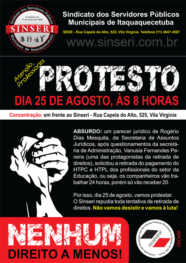 O QUE O SINDICATO VAI FAZER? - O Sinseri, com total apoio da Confederação, Federação (Fesspmesp) e da Pública - Central do Servidor, convoca todos os Servidores e dirigentes sindicais da região para fortalecerem a luta. É momento do setor da Educação, em uma só voz, reivindicar o retorno desses diretos legítimos. Dia 25 de agosto, próxima sexta, a categoria estará concentrada em frente a sede do Sindicato para protestar contra o absurdo retrocesso imposto pela Prefeitura.