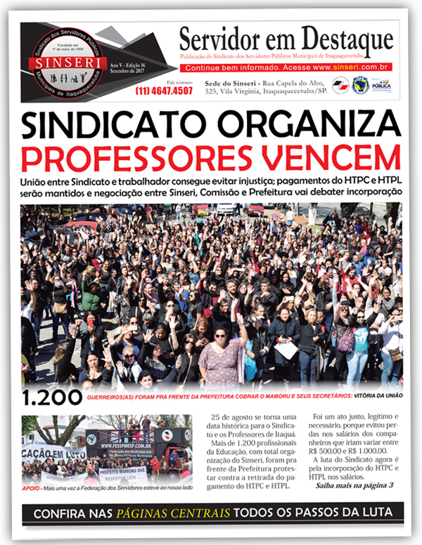 FIQUE POR DENTRO - O Servidor em Destaque é um impresso que circula em toda a base de Itaquá. O informativo apresenta aos companheiros os ganhos mais recentes da instituição, com uma atenção diferenciada para a maior mobilização já organizada dentro do município que conquistou um avanço significativo para os Professores da rede municipal de ensino e mudou os livros de história da cidade.