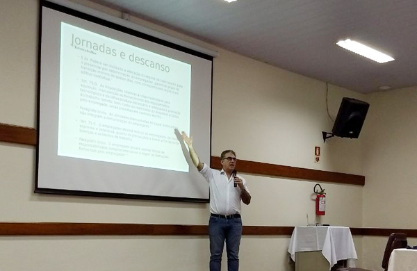 Carlos relatou os principais prejuízos da Reforma e suas respectivas violações à Constituição, falou da importância das Negociações Coletivas com a aprovação da nova lei trabalhista e como podemos desconstruir as inconstitucionalidades na lei.