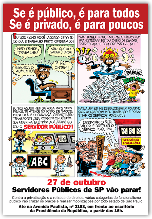As seis principais Centrais Sindicais do País, Pública - Central do Servidor, CUT, CTB, NCST, Intersindical e Força Sindical, estão unidas em ações especiais pela valorização do funcionalismo em outubro. Este, que é o mês em que no dia 28 celebraremos o Dia do Servidor Público, diversos manifestos estão agendados no Estado de São Paulo. Para fortalecer a divulgação, um impresso foi confeccionado em comum para todos. Imprima aqui em seu Sindicato e faça a distribuição.