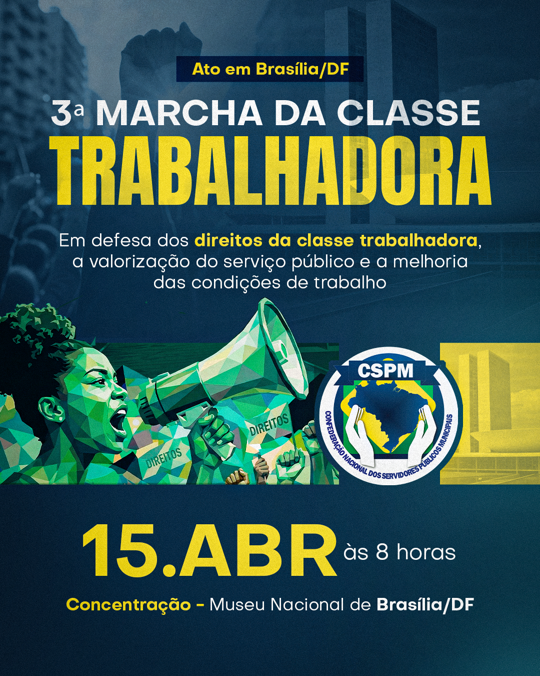 Na defesa dos Servidores Públicos, dos direitos dos trabalhadores e de um País mais justo para todos, nossa Confederação convoca todos os Sindicatos Filiados para a 3ª Marcha da Classe Trabalhadora, dia 15 de abril, às 8 horas em Brasília – com concentração no Museu Nacional, (SCTS Lot 2, Plano Piloto, Brasília – DF).