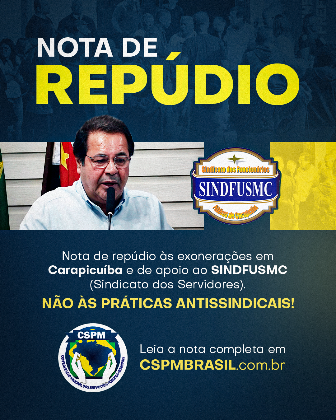 Viemos a público manifestar total repúdio às exonerações ocorridas no município de Carapicuíba, que atingiram Servidores municipais e, de forma particularmente grave, o presidente do Sindicato dos Funcionários Públicos Municipais de Carapicuíba (SINDFUSMC), Jessé Fernandes Cassundé.