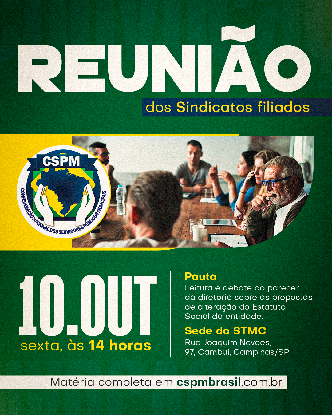 A Confederação Nacional dos Servidores Públicos Municipais do Brasil (CSPM) convoca todos os Sindicatos e Federações filiadas para uma importante reunião. Será dia 10 de outubro (sexta), às 14 horas, na sede do Sindicato dos Trabalhadores do Serviço Público Municipal de Campinas (STMC) – rua Joaquim Novaes, 97, Cambuí, Campinas/SP. Nesta oportunidade faremos a leitura e debate do parecer da diretoria sobre as propostas de alteração do Estatuto Social da entidade.